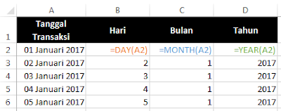 dari gambar diatas, contoh penggunaan rumus tanggalnya adalah untuk memisahkan antara format hari, bulan dan tahun. dengan mengetikan "=DAY( )", "=MONTH( )", "=YEAR( )". dan isi dari dalam kurungnya adalah memilih cell yang sudah ada format tanggalnya.